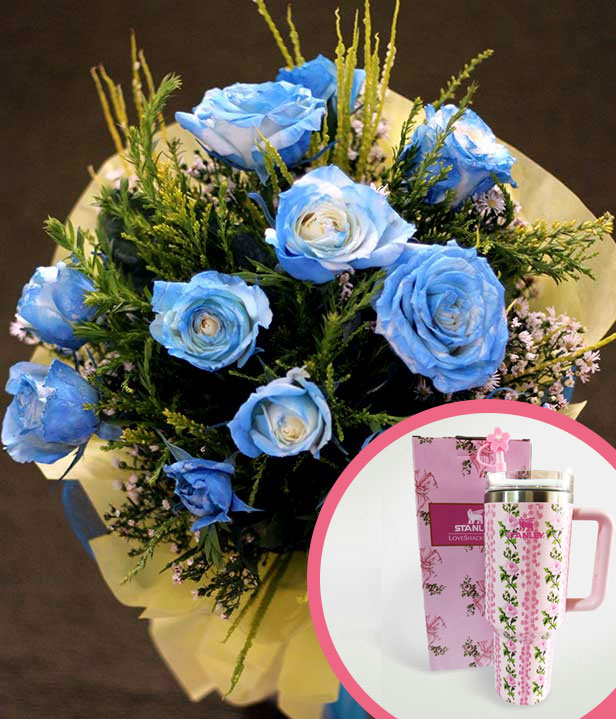 1 Dozen Blue Roses Spray (Round Bouquet) with Stanley H2.O Tumbler 40oz Pink
