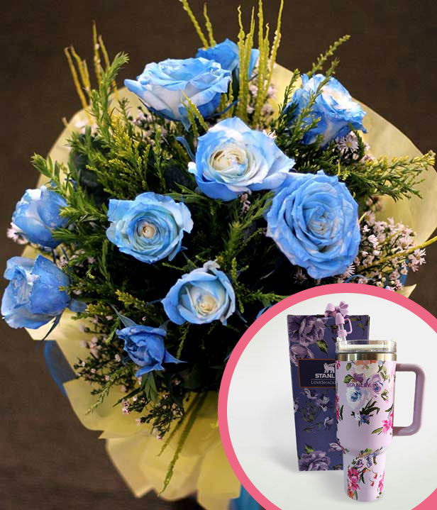 1 Dozen Blue Roses Spray (Round Bouquet) with Stanley H2.O Tumbler 40oz Violet