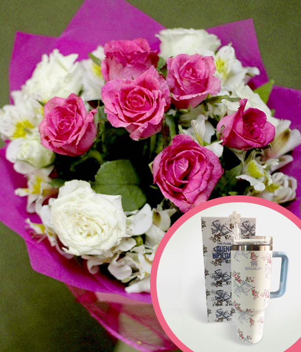 An arm bouquet of 1 dozen mixed pink and white roses with a blue white 40oz Stanley H2.O tumbler.