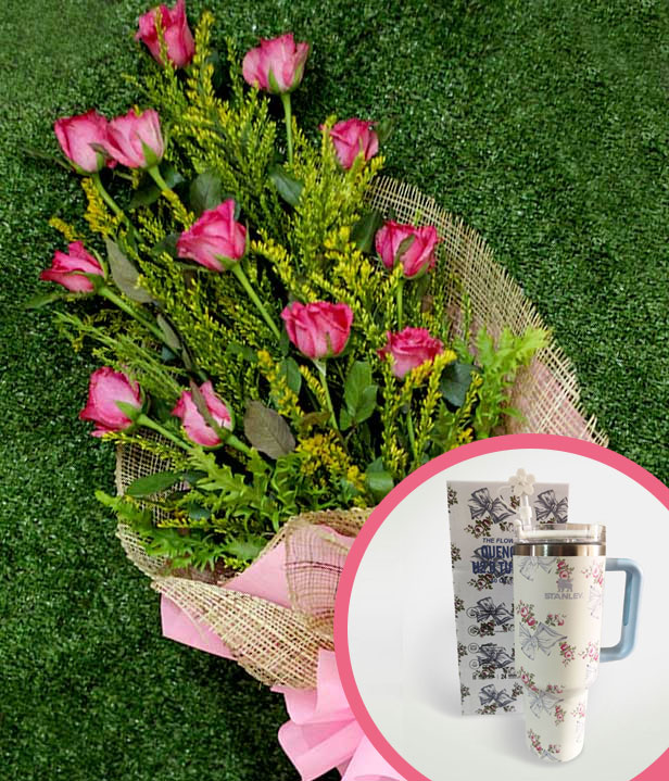 An arm bouquet of 1 dozen pink roses with a blue white 40oz Stanley H2.O tumbler.