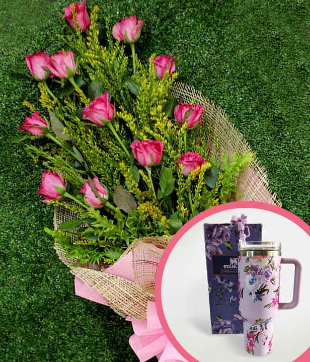 An arm bouquet of 1 dozen pink roses with a violet 40oz Stanley H2.O tumbler.