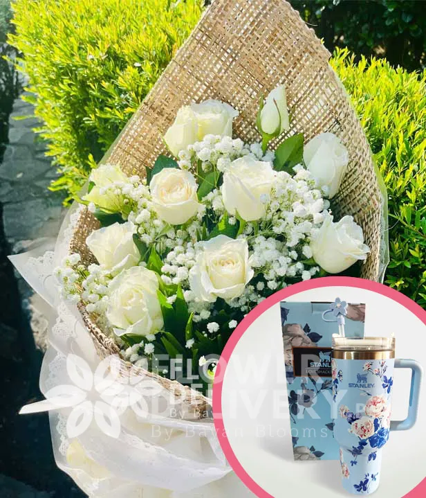 1 Dozen White Roses with Stanley H2.O Tumbler 40oz Blue