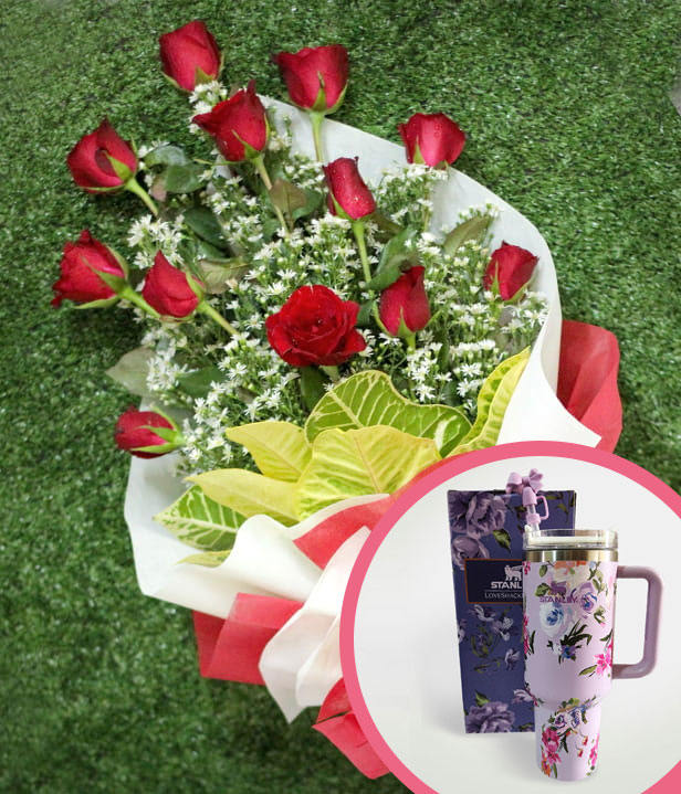 1 Dozen Red Roses (Arm Bouquet) with Stanley H2.O Tumbler 40oz Violet