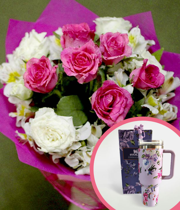 An arm bouquet of 1 dozen mixed pink and white roses with a violet 40oz Stanley H2.O tumbler.