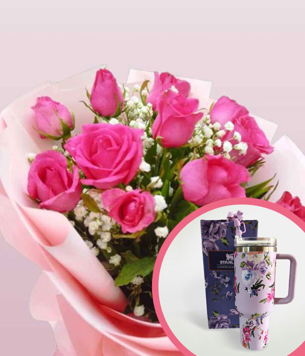 An elegant bouquet of 1 dozen pink roses round bouquet with a violet 40oz Stanley H2.O tumbler.
