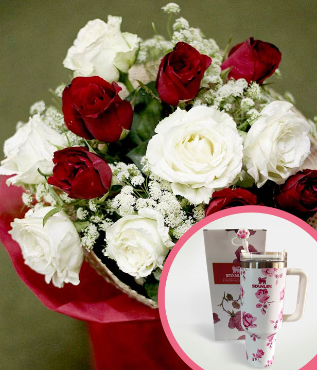1 Dozen Red and White Roses with Stanley H2.O Tumbler 40oz Pink White