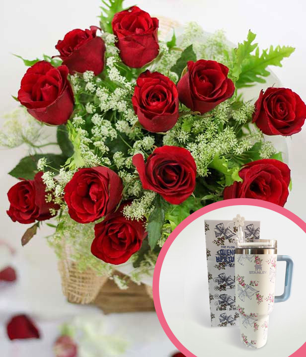 1 Dozen Red Roses (Round Bouquet) with Stanley H2.O Tumbler 40oz Blue White