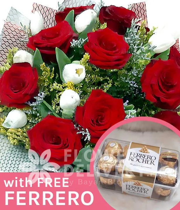 1 Dozen Red Ecuadorian Roses and 1 Dozen White Tulips with Free Ferrero Chocolates