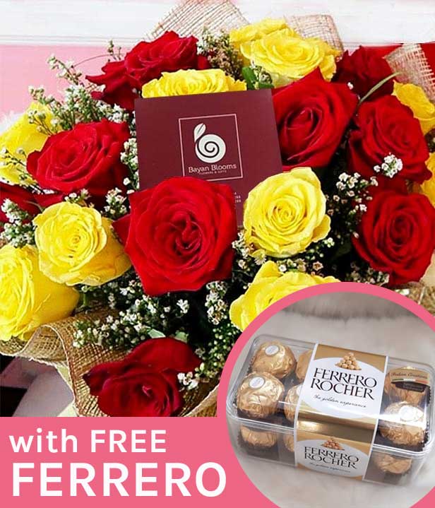1 Dozen Yellow and 1 Dozen Red Ecuadorian Roses with free Ferrero Chocolates